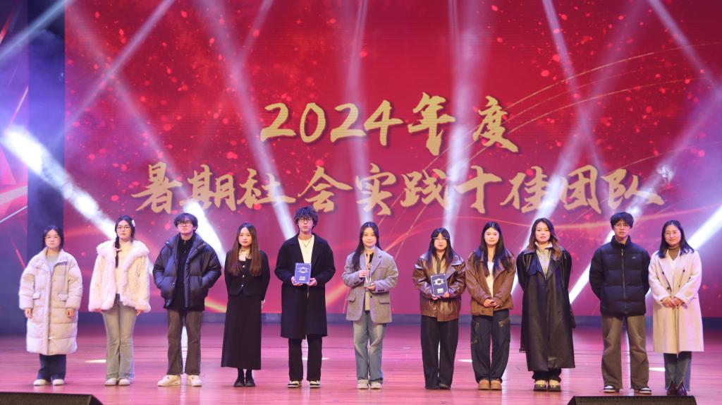 晚会中,304永利集团经理、直属党支部书记李建瑜老师、直属党支部副书记程海丰老师分别为优秀班级、优秀寝室颁奖,并且,李建瑜老师和程海丰老师共同为年度奖学金获奖者代表颁发奖状。校团委副书记王春叶老师为2024年度校级“双百双进”暑期社会实践十佳团队颁发奖状和荣誉奖杯。