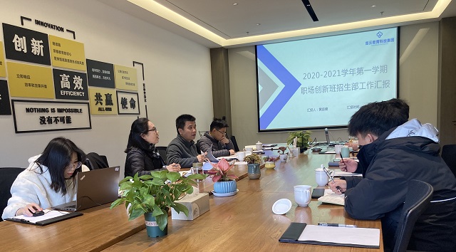 最后,职场创新班项目的学工部、教考部和教务部先后汇报2020年工作开展情况及2021年工作计划和思路,与会双方就重点工作和面临的困难开展深入交流。会上强调,切实做好员工安全稳定工作,特别是假期疫情防控工作,严格落实每日健康打卡和外出审批工作,并制定新学期的开学预案等。