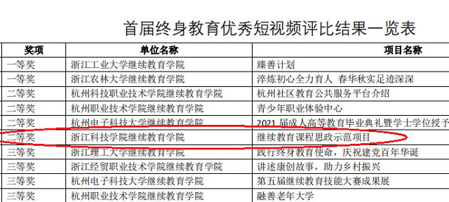近日,公司录制的“同行同向,协同育人”课程思政宣传视频在杭州市成人高等教育协会组织的首届终身教育优秀短视频评比活动中荣获二等奖。