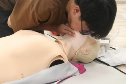 顾老师重点讲述了心肺复苏术(CPR)及自动体外除颤仪(AED)的操作流程和使用规范,并对相关救护操作要领进行现场示范。随后,大家积极参与体验,进行“心肺复苏”的模拟实操。