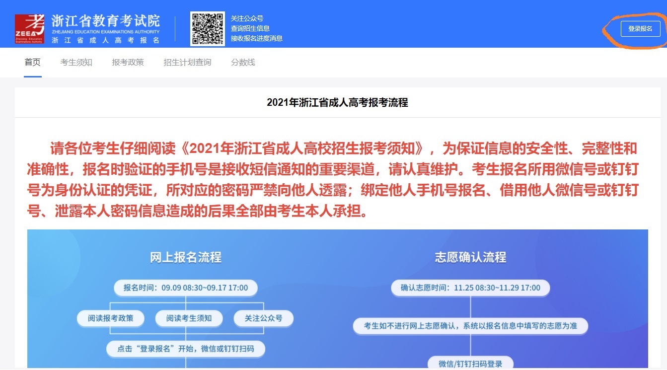 登录www.zjzs.net进入“浙江省教育考试院”网站,点击屏幕右边服务平台下的“2021年浙江成人高校招生网上报名”系统进入报名。如果打不开,请更换浏览器再次尝试(9月9日报名系统将正式上线)。