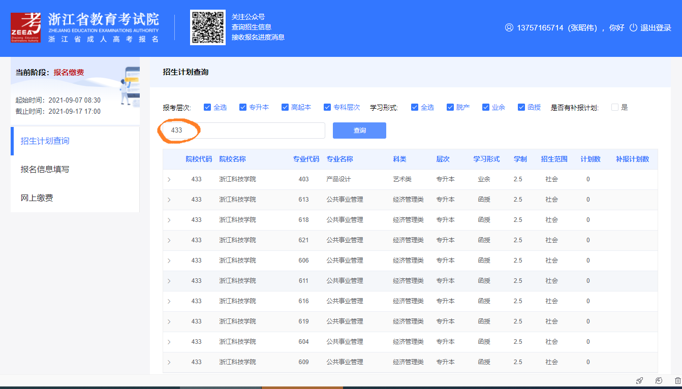 进入报名缴费阶段,可在招生计划查询板块输入433,按层次、学习形式查询“浙江科技公司”2021年招生专业信息。