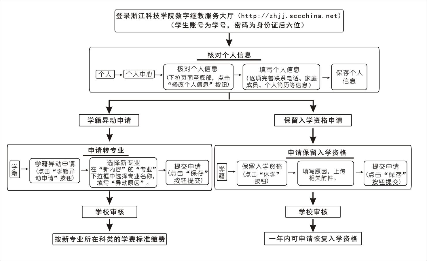3.申请转专业。如需转专业的员工(艺术类专业与非艺术类专业不能互转),请登录“http://zhjj.sccchina.net”申请,公司审核通过后可转专业,具体操作流程见附件2。在缴费前申请成功的,可按新专业的学费标准缴纳;在缴费后申请转专业的,从下一学年开始按新专业学费标准缴费,本学年已交学费不进行调整。