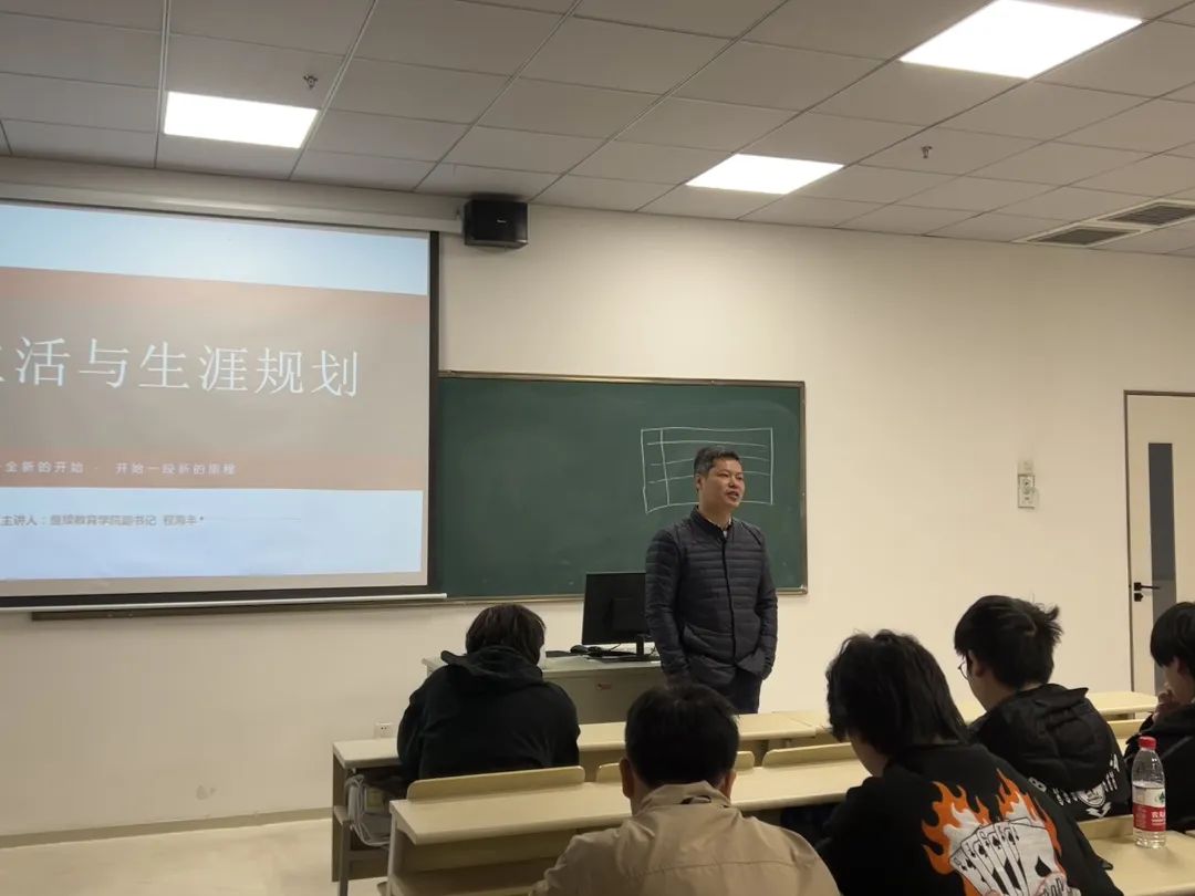 12月7日上午,院直属党支部副书记程海丰老师在科创313教室为跨境电商211班和建筑设计213班全体同学上了一堂以“老员工活与生涯规划”为主题的生涯规划课。