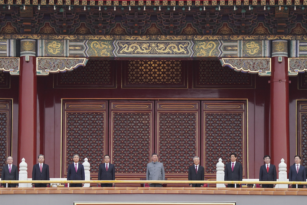 上午7时53分,在欢快的乐曲声中,习近平等党和国家领导人来到天安门城楼主席台,全场爆发出热烈掌声。