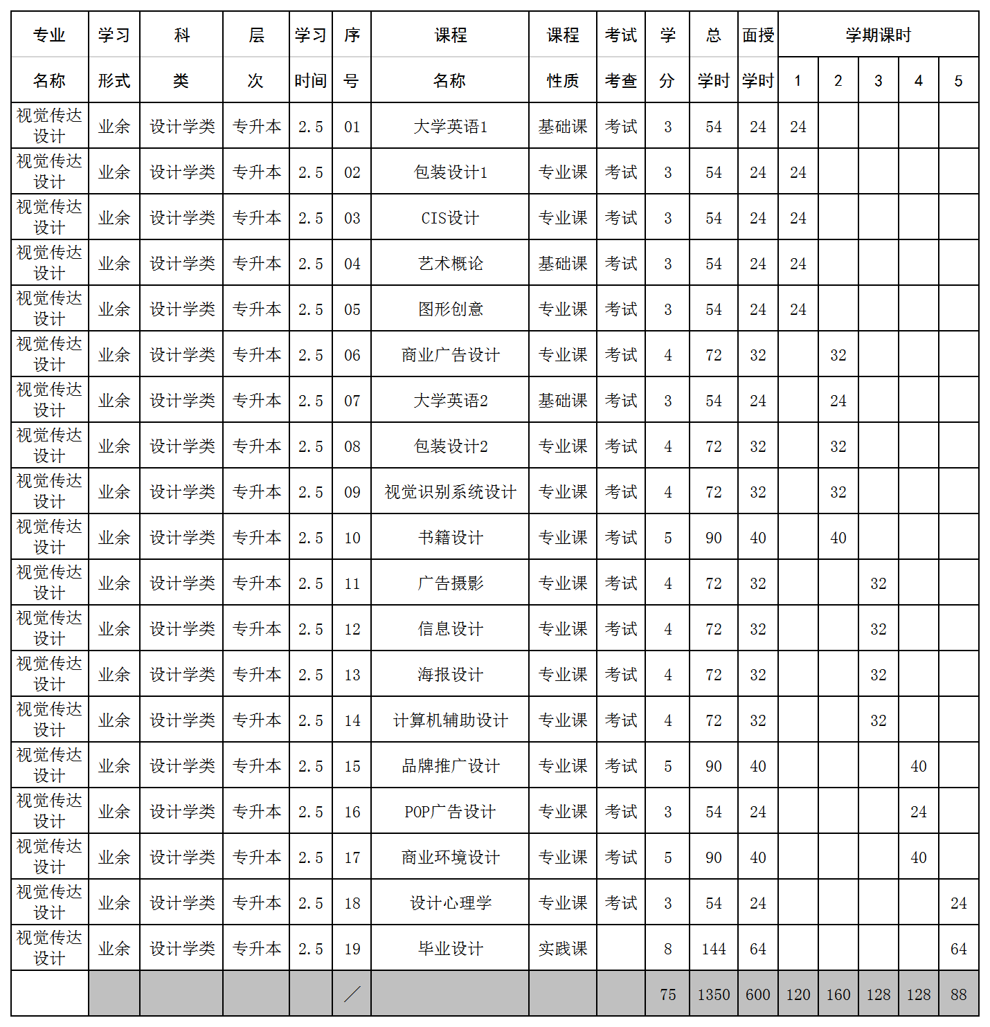本专业设置的主要课程有艺术概论、包装设计、商业广告设计、书籍设计、视觉识别系统设计、图形创意、海报设计等课程。